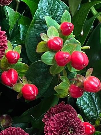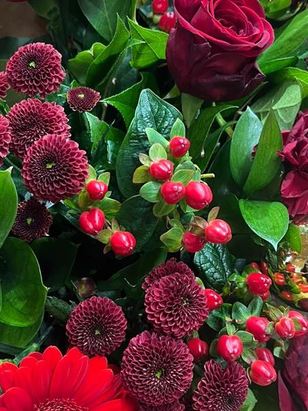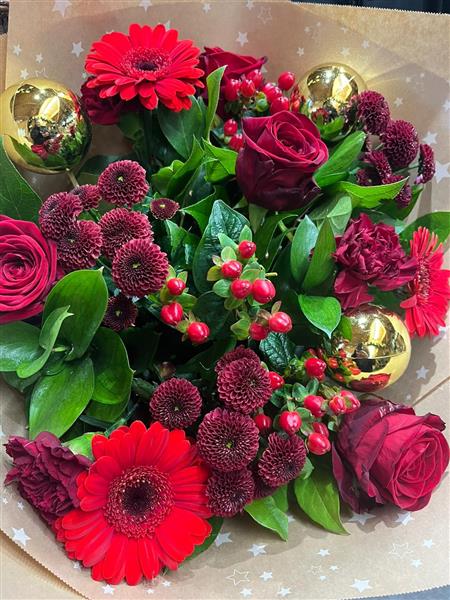 Beautiful Xmas bouquet consisting of gerbera, hypericum and a selection of other flowers.