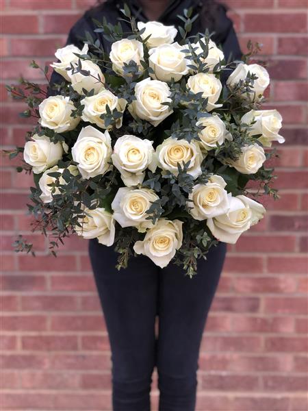 Large as shown on a picture 24 white roses.