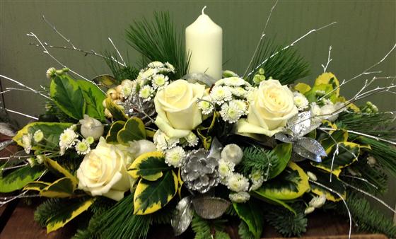 Beautiful table centrepiece with Fresh flowers and large long burning candle.