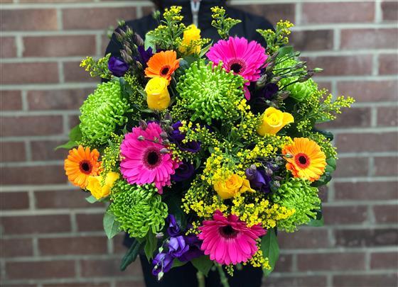Bright flower bouquet, including green blooms, yellow roses and bright gerbera.