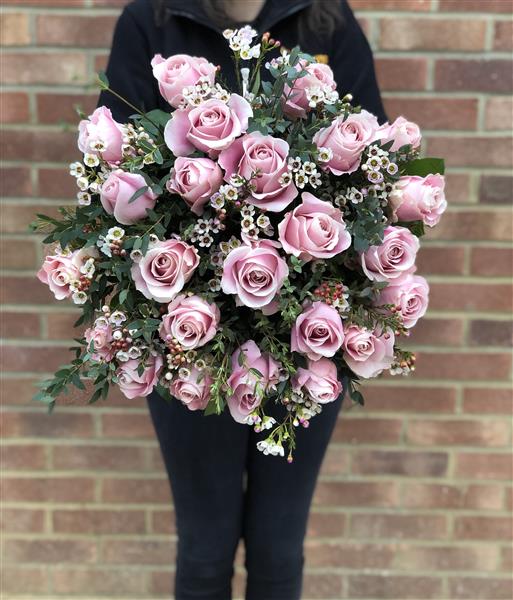 Beautiful pink roses, encased in mixed green foliage with white wax flower.