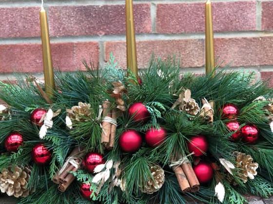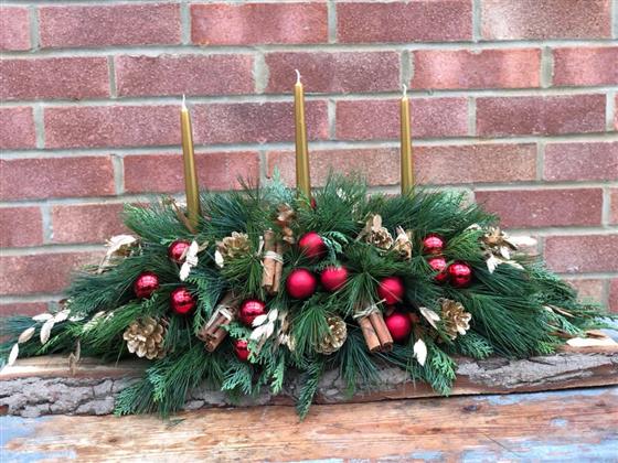 Classic red and gold festive Christmas candle centrepiece (wooden slice not included). Please allow one day's notice when ordering. Please note the candles will be cream